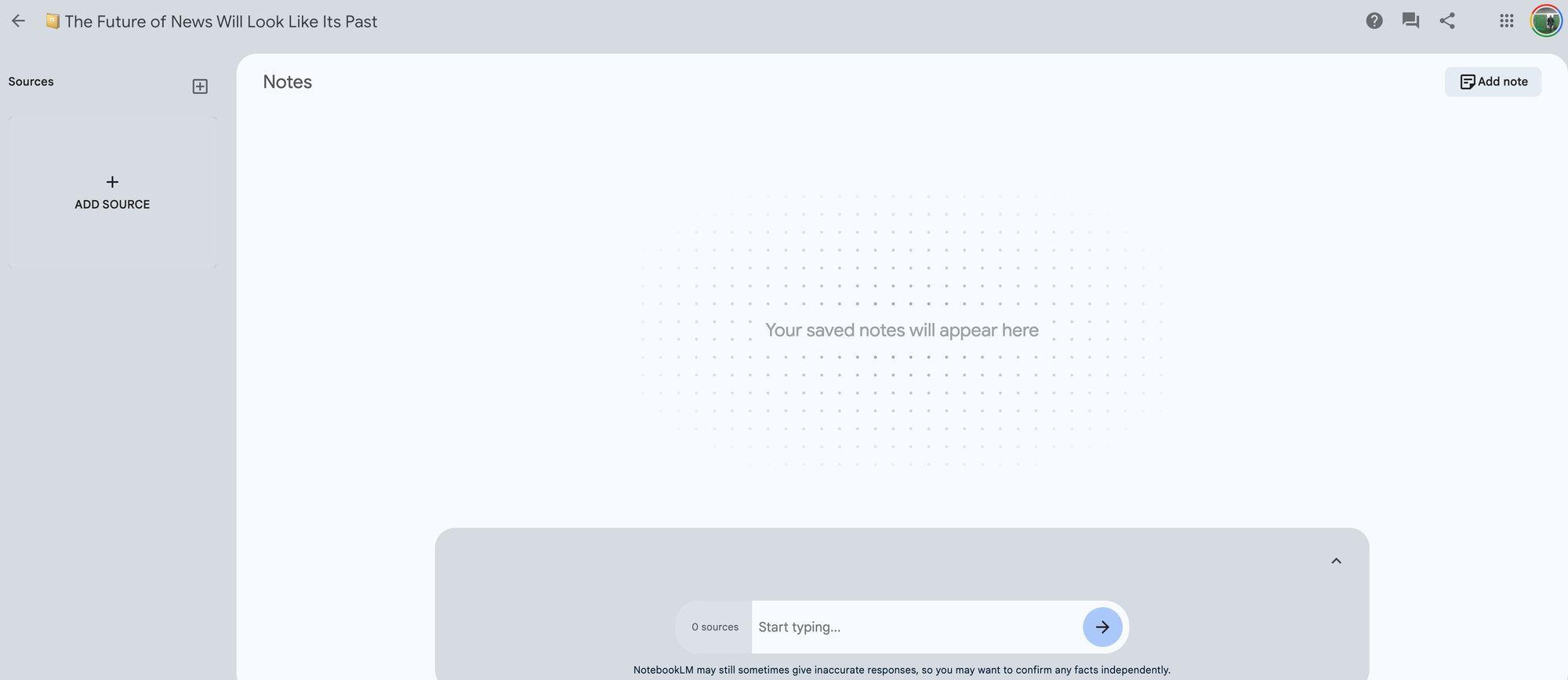 NotebookLM also suggests questions that can be derived from my given source text. I can also add digital post-it notes to the main view screen here. So the main viewer is either my Q&A with the LLM or my non-sortable notes. Come to think of it, I don’t need the ability to scan urls so much as I need an AI assistant to help build out my sources so that I can tell a more textured story than I can get from my own given references.