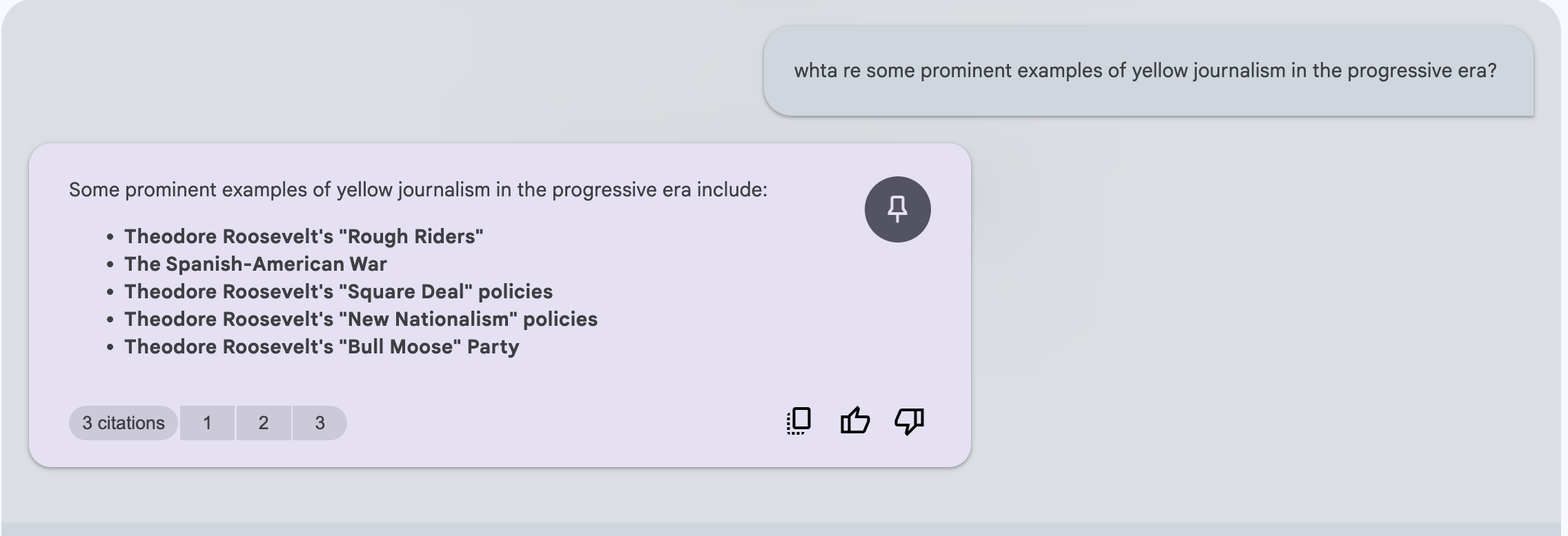 I suppose since I am keen on building out and cleaning up my references, I’ll start with the area I’m most concerned with: Citations for my historical descriptions. So maybe I’ll just type in: what are some prominent examples of yellow journalism in the progressive era?
