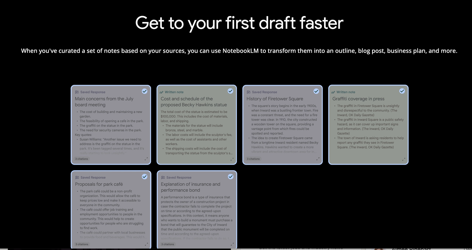 If I could figure out how to make the supposed integration with Google docs work, I would drag my notes into whatever order I want, and re-write them for my audience’s specific needs. Then, as I put the piece together, the Notebook LM AI could: