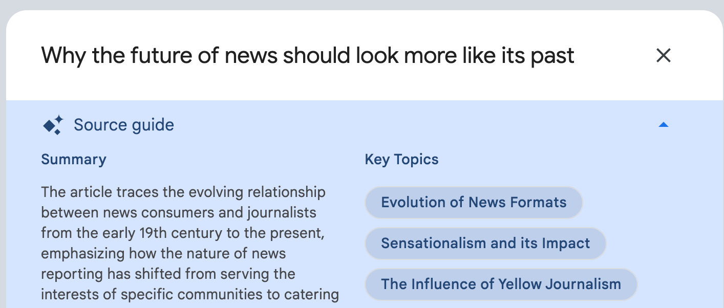 So, I’m on the advisory board for The Center of Media Engagement at the University of Texas. Their formal reports have PDF versions that I can access. I could upload all of those PDFs into NotebookLM, and ask the AI a series of questions about the research. Such as: What are the key areas of study for the Center this year? Which media intervention seems to have had the most success? Can you list all of the local news organizations who partnered with the center on these projects?