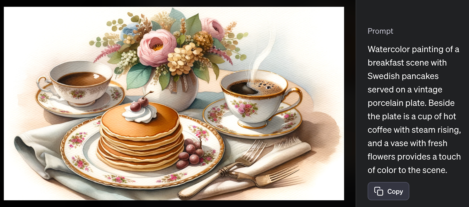 I was pleasantly surprised to find that they surface the rewritten prompts. My initial request to “Draw me a plate of Swedish pancakes and lingonberry sauce” was augmented with requests for the pancakes to be styled with steaming cups of coffee, silver forks, and breakfast scones.