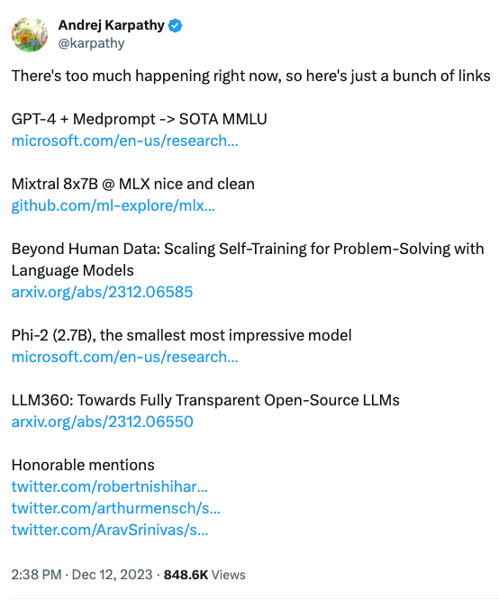 The top-level story is that everyone is racing to train better, smaller and faster LLMs. AI Twitter gets very excited when a new competitive model is released. The super secret GPT-4 model from OpenAI is still the one to beat, but the open source competitors are getting closer. Mistral claims Mixtral outperforms Meta’s largest model (Llama 2 70B) on “most benchmarks with 6x faster inference.” So the model is very good and very fast.